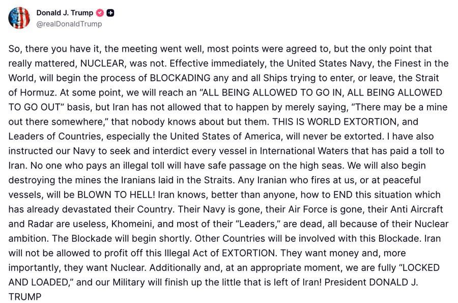Donald Trump announced Sunday that the US Navy will begin blockading all ships attempting to enter or leave the Strait of Hormuz, hours after talks in Pakistan to end the Iran war ended without resolution. The declaration didn't come with a diplomatic note to allies which have been left out in the dark by the Trump administration. It came via Truth Social, in capital letters, and it takes effect immediately.